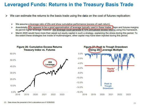 Think of the basis trade as the great liquidity sponge inside the hedge fund community: if hedge funds are allowed by their generous repo counterparties to lever up, they do just that anywhere between 20x and 54x...