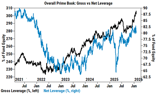 Overall Gross leverage rose +1.7 pts (driven by mark-to-market) to 306%, while US L/S Gross leverage fell -0.8 pts to 225% (98th percentile one-year). Both Gross and Net exposures remain elevated vs. the past year. Some more details: