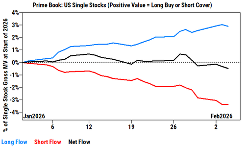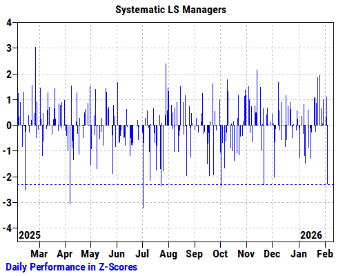 - Systematic L/S (Quant) down 82 bps, worst day since 10/2/25, driven by momentum sell-off and crowded short squeezing. Losses are coming from both Europe and US books. The only saving grace: still up 2.5% YTD.