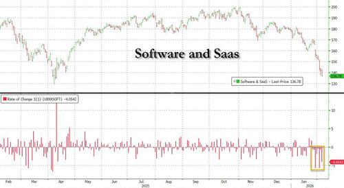 Fast forward one day to Thursday's rout, which saw a historic plunge in bitcoin, but also continued selling across momentum, software, and semi names. Still, away from the brutal rout in crypto and silver, we did see less violent factors moves even as the market sell-off continued.