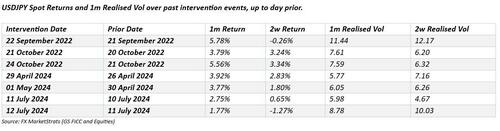 “We are reluctant to focus too much on historical interventions and their average impacts on the Yen. The dynamics this time round feel very different - USDJPY has already traded from 159.23 highs post the BOJ on Friday to below 154 Monday morning, but excess volumes stand at a fraction of the previous intervention days. Additionally, it was widely reported Friday evening that the Federal Reserve performed a rate check on behalf of the US Treasury – this is very different to the “usual” Japanese official led rate checks and interventions.