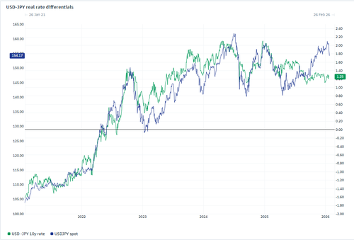 We are short USDJPY with a target of a move below 150. From a fundamental perceptive we see the nominal and the real spread differential between the US and Japanese rates reducing sharply over time. BoJ is in a hiking cycle and the Fed (we believe) is in an easing cycle. We also believe that JPY should benefit from the USD diversification trade that started with the tariff wars and is likely to extend this year with more uncertainty in the US policy framework. As events since the start of the year have shown, Trump policies have become more interventionist and which should further help the US diversification trade. Our view remains that the USD diversification trade should be relative to precious metals and vs Asian currencies. It's not just the JPY, we should also see other Asian currencies including KRW, TWD and SGD strengthen vs USD.
