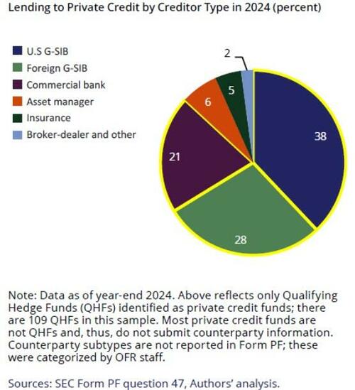 Bank loans to non-bank financial institutions have ramped higher in the last one to two years, with more than $200 billion of obligations extended, according to the BIS. The Office of Financial Research comes to a higher estimate which includes borrowings to SPVs: $410-$540 billion of non-bank and bank exposures to private credit, with the bulk from the latter.