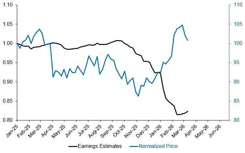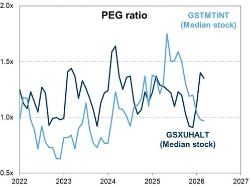GS Research pointed out recently: reflecting the increasing investor desire for “AI insulation,” asset-heavy stocks have outperformed sharply in the last few months. Asset intensity is defined as the ratio of a company’s assets, less cash and intangibles, to revenues. After years of asset-light outperformance, our sector-neutral basket of tangible asset-heavy stocks (GSTHHAIR) has outperformed our basket of asset-light stocks (GSTHLAIR) by ~20 pp since the start of November. GSXUHALT filter for the companies that have rallied in line with GSTHHAIR but have no earnings growth estimates to justify this rally.