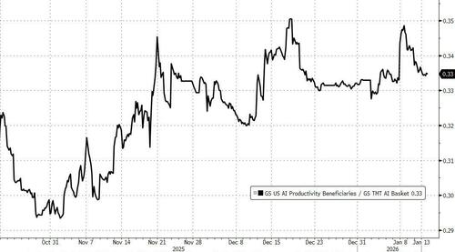 A related point: I do find it interesting that our basket of companies that are set to benefit from AI productivity in their core businesses (ticker GSXUPROD) has been outperforming the basket of companies who supply the picks and shovels (ticker GSTMTAIP).