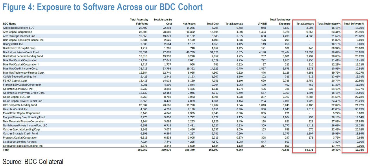 Starting at the top, as of the third quarter of 2025, the total investment portfolios across the 30 BDCs tracked by JPM is $359bn, of which, software is ~$70bn or about ~16%. The exposure varies from Blue Owl Technology Fund at about 40% of the fund to TSLX being negligible. Note that the total technology exposure is around $80bn (here we are only outlining the exposure that is classified as software). It is not possible to capture total exposure as some technology companies may be classified in the sector that they serve, i.e. AthenaHealth is a healthcare technology company that was under slight pressure this week, but under BDC schedule of investments (SOI), is classified as healthcare and not technology or software.