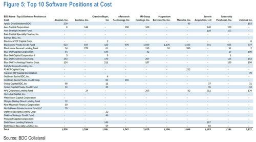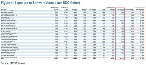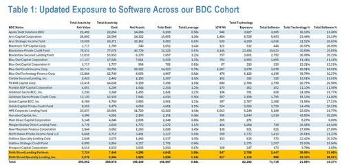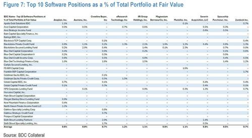 (As an aside, in a follow up report published by Caprihan this morning, he updated the table with software loans at the Sixth Street BDC: Software accounts for a whopping 31.68% of TSLX’s total portfolio at fair value and 26.61% of SIXSLP’s. Total software exposure increased by ~$3.2bn for the cohort when adding TSLX. The updated report can be found here).