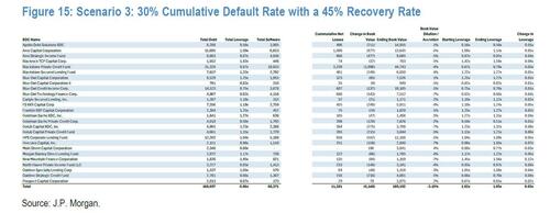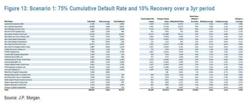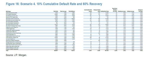 A 75% default rate and 10% recovery assumption for a 67.5% cumulative loss over a single year with no accretion from NII is the most severe scenario that could be modeled. A couple of methodology clarifications: JPM is working with 3Q’25 leverage metrics (not ideal since leverage increased in 4Q’25), and assume total debt remains the same (also a very conservative assumption), did not factor in any benefit from imbedded equity gains (conservative assumption), and are essentially looking at starting leverage and ending leverage. JPM, which is clearly terrified of spooking various BDCs it would find as insolvent and who just happen to be the bank's clients, also cautions that it does not note that the starting leverage for some of the private, perpetual structures is very low (APODS at 0.50x, GSCRED at 0.50x and OAKSCF at 0.66x).