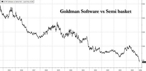 Sure enough, in its mid-day wrap, Goldman highlights the "relentless weakness in software continuing today, and testing April liberation day levels with the sector down 9 of the last 12 sessions." The bank's software vs semis pair (GSPUSOSE) is down a whopping -495bps today and is an epic disaster over the longer-term.