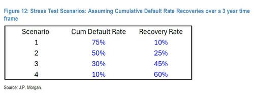 JPM ran a variety of different scenarios for its stress test, from 75% losses on the software book over 3 years, a 30% default rate & 45% recovery over 3 years to the most draconian, a 75% default rate with a 10% recovery so a 67.5% cumulative loss rate. The bank was quick to stress - no pun intended - that these are stress tests in isolation; the analysis only looked at defaults on the software book.