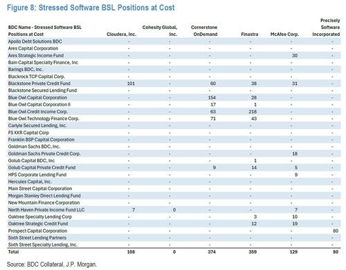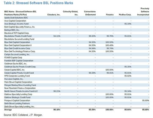 Next, the JPM amalysts looked at the BSL market to analyze recent large declines in the software sector and to determine which BDCs have the largest exposure to these ‘stressed’ positions. This is only a subset of the BSL universe and accounts for only 25% of the software loans outstanding in the BSL market. The report identified six software loans that would be considered stressed, all of which have been marked down by 5pts over the recent months or weeks in the secondary market.