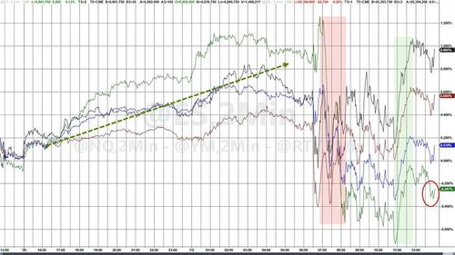 Nasdaq swung from being up over 1.2% shortly after the US cash open to end down over 0.6% at its worst of the day. Small Caps were big gainers and the S&P desperately tried to end green (ending its losing streak at 4 days)...