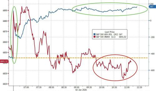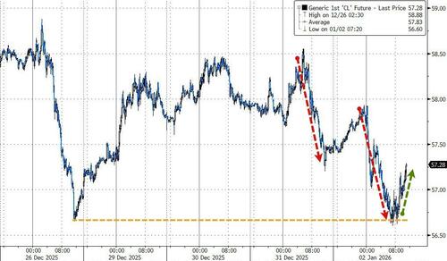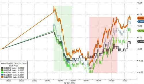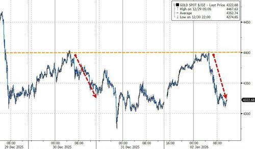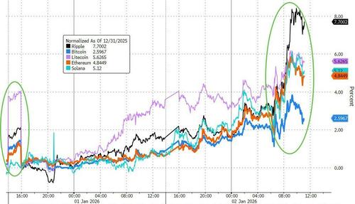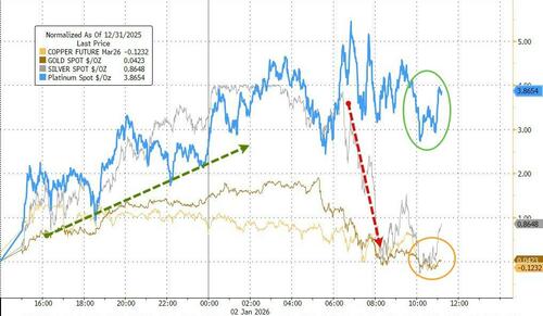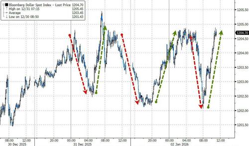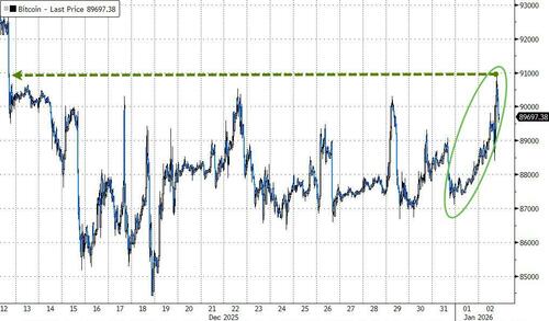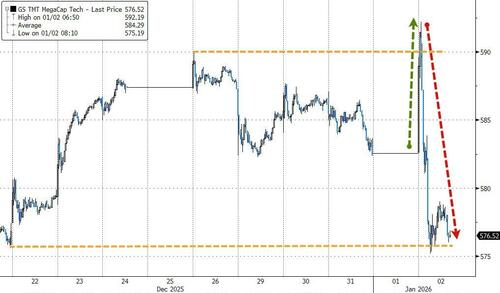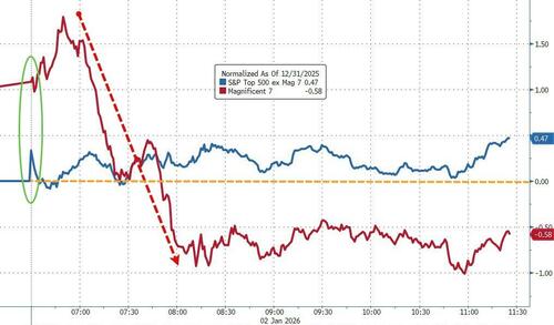 2026 started 'mixed' with overnight gains in big-tech stocks being quickly erased (while the broad equity market managed gains), crypto rallying strongly, oil & metals unch (platinum strong), and TSY yields and the dollar higher.