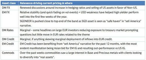 The “Sell America” narrative has so far had a higher impact on FX (weakening the dollar to DM pairs on the back of higher hedging ratios as well as to EM pairs on the back of carry diversification), EM credit (again on the back of carry diversification to countries with lower weights on international investors’ holdings) and commodities (in particular metals on the back of politically-safer reserve assets and a move towards resources’ protectionism). DM credit and DM rates have so far only been marginally impacted by the narrative in our view.