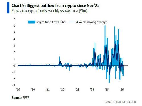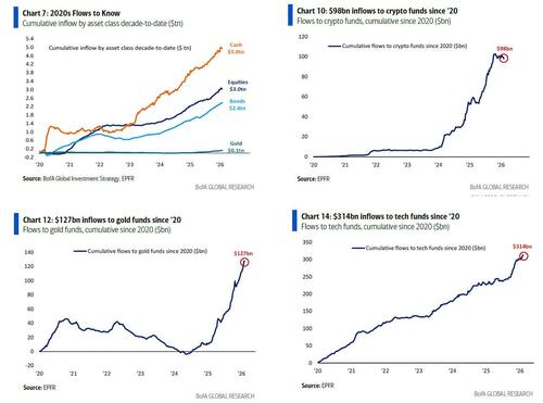 While we usually leave the weekly fund flow data up to readers to unpack, this week there were some notable changes, especially for gold and crypto. Here is Hartnett's breakdown of the latest EPFR fund flow data: Weekly Flows: $87.2bn to cash, $34.6bn to stocks, $23.0 bn to bonds, $0.8bn from gold, $1.5bn from crypto.