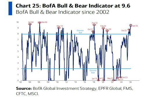 One month ago, Bank of America CIO Michael Hartnett, who had recently redesigned the bank's closely watched Bull and Bear Indicator found something troubling: as of the start of 206, the (new and improved) Sell signal had been triggered as it stood at a "very bullish 9.0 as outflows from tech stocks & EM debt offset by very strong global equity breadth (98% of country indices above 200dma), super-low BofA Global FMS cash positions (record low 3.3%), hedge funds adding to S&P 500 longs via futures." And this is how the indicator rose to its highest level sinc 2018: 8.5 on Dec 17th, 8.8 on Dec 24th, 9.0 on Dec 31st. (incidentally, in the latest week, the Bull/Bear index rose from 9.4 to a stunning 9.6- the highest since Mar'06 on strong inflows to tech & high-yield bond funds, record-low FMS cash, strong global stock index breath, offset by EM debt outflows, hedge funds cutting gold longs & VIX shorts; positioning excess bullish…contrarian “sell signal” for risk assets).