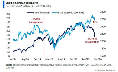 So what happened? As Hartnett writes in his latest Flow Show note (available to pro subs), it had to do with the combination of "peak positioning, peak liquidity, peak inequality"… and is why the “Bro Billionaire” plays (namely NVDA, META, PLTR, TSLA, ARKK, APO, BX, ORCL, COIN, XBT), are now up just 6% since inauguration (and bitcoin is well below Nov 2024 levels), vs small cap stocks up 13%. It's why Hartnett continues to press a trade he recommended first a few weeks ago, namely "long Main St, short Wall St"... and will be so until Trump's approval rating go up on policy pivot to address affordability.... He may be waiting for a while.