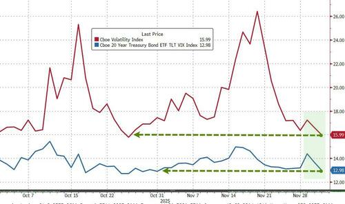 Both equity and bond vols fell notably today back to one month lows... Just between us girls, The FT attempted a scare-mongering post this morning: "*BOND INVESTORS WARN TREASURY ABOUT HASSETT AS FED CHAIR: FT" - given the collapse in bond vol expectations, that sounds like utter bullshit (and did they ask the short-end bond traders, or crypto traders, or gold traders, or growth stock traders how they felt?)