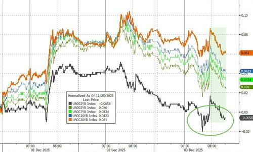 Treasuries were bid alongside stocks today (QE trade is back?) with the whole curve down around 3bps. Today's decline in yields pulled the 2Y lower on the week...