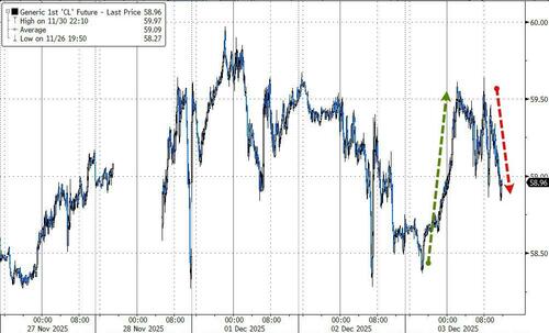 Crude prices were higher on the day (amid a lack of progress on a peace deal) but well off the highs of the day amid the weak macro data (tracking bond yields lower) and a big build across crude and products. It's been a choppy week for WTI..