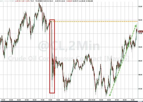 Oil prices (both WTI and Brent) plunged 6-7% from yesterday's highs to overnight lows before rebounding from that kneejerk lows, erasing almost the entire drop by the close...