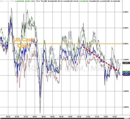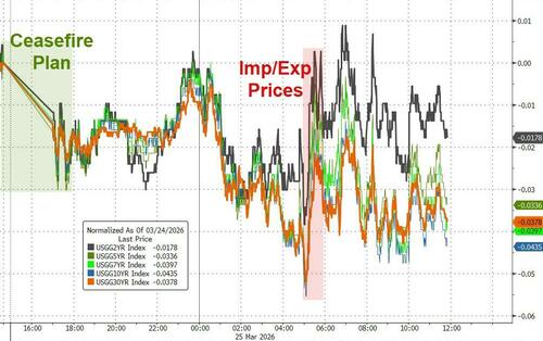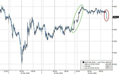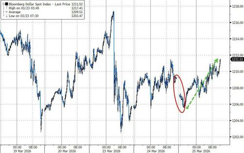 Tl;dr: Last night's US proposal for a ceasefire (and subsequent rejection by Iran) were the drivers of the day's price action with the massive kneejerk lower in oil (higher in stocks) giving way to a slow bleed higher in oil. But... stocks and bonds did not track with oil's reversal. The dollar ended flat while bitcoin and gold managed strong gains.
