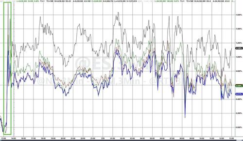 US Treasury yields were lower today (decoupling from the moves in oil - as we noted at the start) with the the long-end outperforming (30Y -4bps, 2Y -2bps) despite another ugly auction (5Y)...