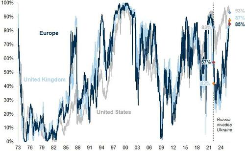All of which, she concludes, means 'cash is king' again: Binary risk environments reward optionality and liquidity over conviction. Investors that do well in such instances aren't ones that call the bottom correctly, they are the ones who had cash to deploy when uncertainty cleared. Given near zero equity risk premium and all time high valuations across regions & sectors today, cash is actually a reasonable asymmetric position – you give up almost nothing in expected return and gain significant flexibility!