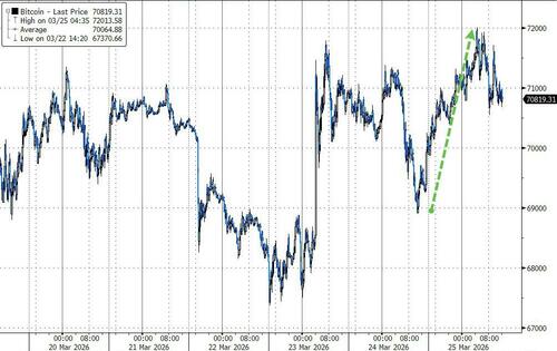 Bitcoin tested $72,000 before fading back below $71k and actually underperformed gold for the first time since the war began...