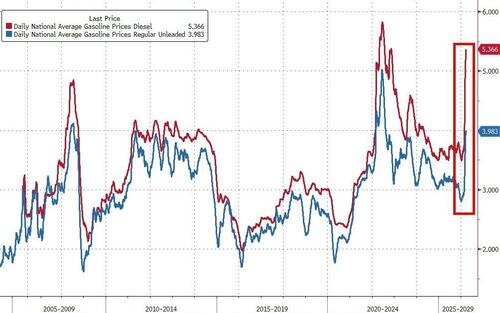 Shifting down the pipeline, refined products (gasoline and diesel in this case) continue to charge higher with the latter now above $5 a gallon for nine straight days...