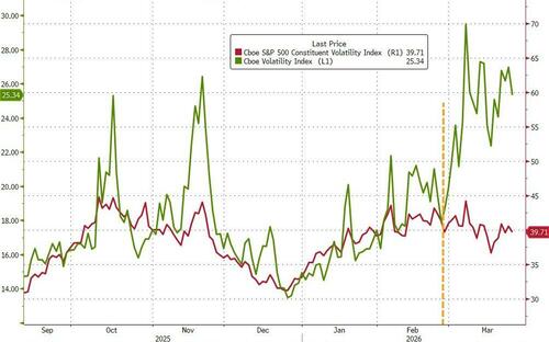And with that in mind, since the war began, single-stock volatility is actually lower... while index vol is (obviously) significantly higher...
