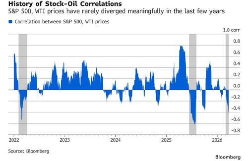With that 'decoupling' in mind, Bloomberg reports that the current spell of negative correlation between the S&P 500 and WTI - 17 days beginning March 3 - has also hit a level of significance that has only been surpassed twice since the start of 2022.