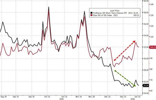 Before we leave equity-land, we do note that while short-term vol expectations remain muted, there is a bid for upside vol protection (VVIX back above the 100 Maginot Line)...