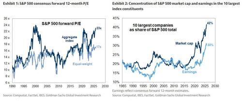 Finally, as Goldman's Chris Hussey points out, the S&P 500 P/E multiple is nearing levels it has seen during each of the past two Tech bubbles (2001 and 2021). And much of the index's market cap and earnings are concentrated in its 10 largest constituents, highlighting the narrow breadth dynamic that we have seen as a result of continued big tech outperformance...