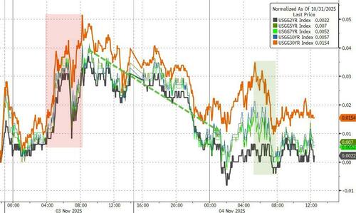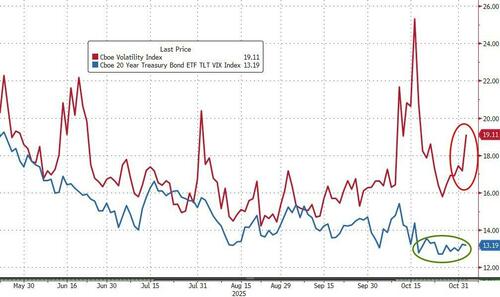 Notably, bond vol remains muted while equity vol is breaking higher. UBS warned earlier than a bond vol spike could be the trigger for the next pain trade down in stocks...