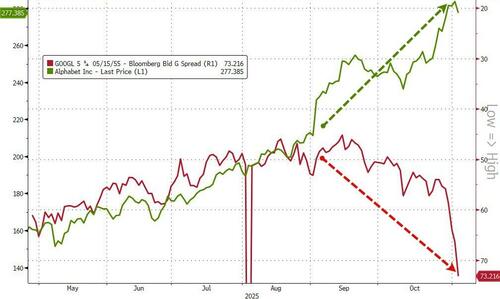 ...as the major AI related names (ORCL, META, GOOGL) have issued a shit-ton of debt to fund their CapEx dreams. GOOGL's stock price is now extremely decoupled from its bond risk...