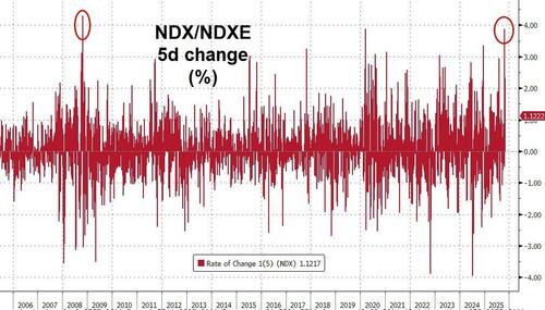 Goldman's Peter Callahan noted that the rolling 5-day performance spread of the NDX vs the NDX Equal-weight (NDXE) index hit ~4% last week, which (quietly) checked in as the widest 5-day spread since 2008...