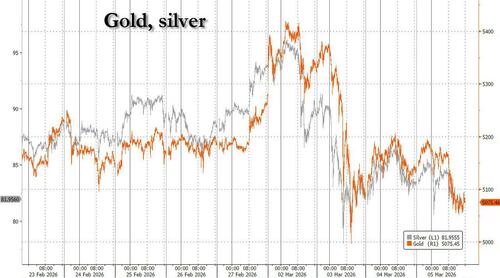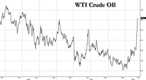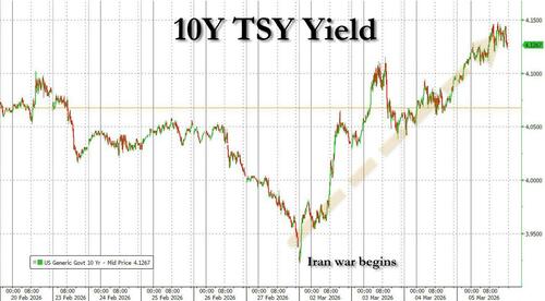 Away from equities, 10Y yields rose for a 4th straight session, now straight up since the Iran war started last Friday, when 10Y yields were 20bps lower.