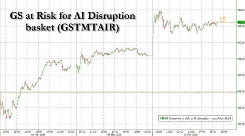 Before we look at other asset classes, let's take another look below the surface, where the news that OpenAI was abandoning checkout for shopping triggered a bid in Goldman's AI at Risk for Disruption basket which jumped more than 2%