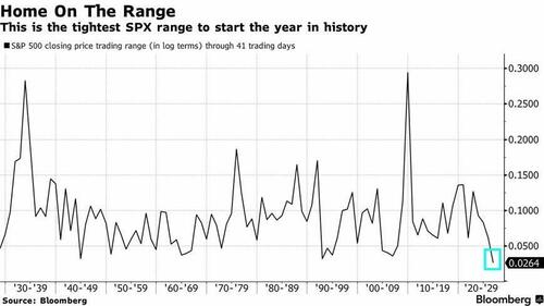 Finally, today's chart of the day is a surprise: as Bloomberg shows, despite all the moves under the hood, the S&P continues to see the tightest range to start the year in history!