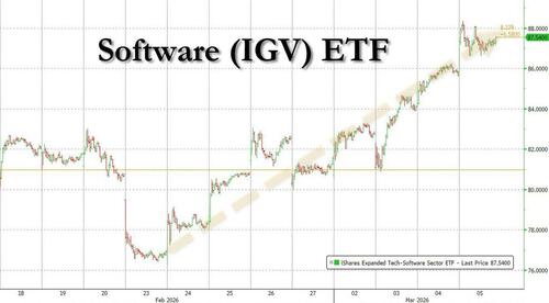Here, a quick aside: recall, one wee ago we wrote the rhetorically titled "Will Anthropic's Clash With Hegseth Trigger Historic Software Short-Squeeze" and since then the IGV hasn't had a down day, mostly thanks to Anthropic getting blacklisted by the Pentagon which in turn sparked a massive short squeeze in this most hated of sectors: and why not, if Anthropic is hated by the government, it's safe to say that it's unemployment boosting agents will hardly get a welcome reception by the White House either.