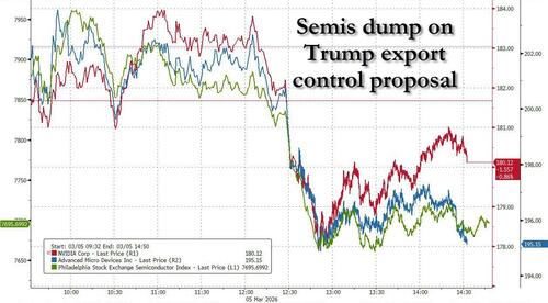 ... before hitting session lows after Bloomberg reported that the Trump admin is planning to require export permits for global US chip sales, and especially those from Nvidia and AMD, to limit the spread of US AI technology.
