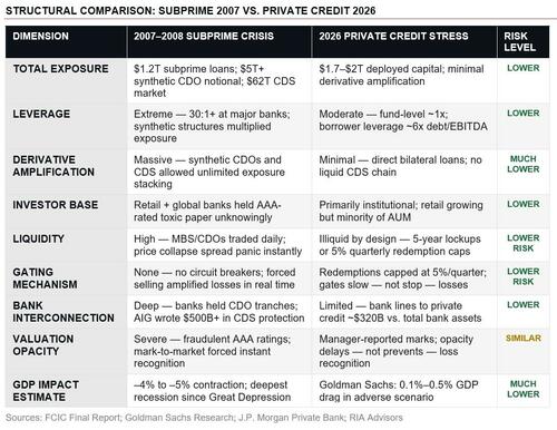 The subprime crisis analogy fails on the specifics. But the lesson from the subprime crisis isn’t about CDOs. It’s about what happens when credit markets expand rapidly, underwriting discipline erodes under competitive pressure, and opacity masks deteriorating loan quality. On those broader conditions, the warning is more relevant than the Goldman bulls would like to admit.