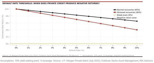 J.P. Morgan’s analysis showed that for senior direct lending to produce negative total returns, default rates would need to exceed 6% while recovery rates would collapse below 40% simultaneously. Those numbers have historically appeared only during COVID and the Global Financial Crisis itself. That’s a high bar — but it’s not an impossible one. However, that would require a deterioration in macroeconomic conditions, a continuation of the Iran conflict oil shocks, and a contraction of consumer spending, which could certainly amplify risks. As shown below, the current structural comparison between the subprime crisis and the private credit sector today is markedly different.