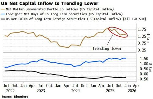 Net capital inflow to the US is trending lower but is not negative.