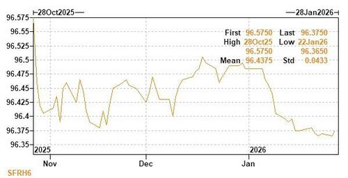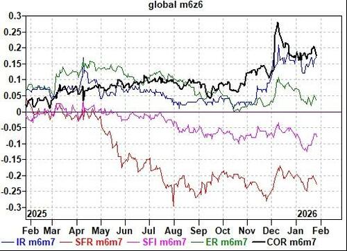2/ At 4bps priced, March FOMC was our preferred front end long given optionality over two nfp releases, but an impending second gov’t shutdown will almost certainly erode the favorable calendar effects. We view SFRH6 longs as a high quality expression, premised on the view that Apr meeting can retain premia if data releases are backloaded into the start of q2, and/or SOFR/FF (and by extension FF within the band) can richen meaningfully as the near-term TGA rebuild is reversed by mid-February. But in an environment where vol continues to compress, we fully acknowledge that tails and wingy options remain just that.