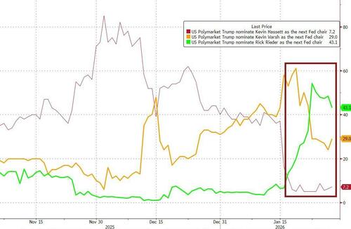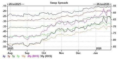 The market had somewhat started to do a Reider as chair trade, with duration bull flattening and spreads richening, but a wrench was thrown into that yesterday, with weakness in the USD seemingly spilling over into rates as a sell America moment, with duration bear steepening and spreads tightening. On spreads, I think we have seen a bout of more intense volatility the last two weeks, with the market showing some signs of vulnerability and crowding. Last week, weakness in JGBs, an increase to Warsh's odds, and increased geopolitical uncertainty around Greenland, had led to 30y spreads to tighten from their then highs of the year around 6bps to -68bps, before bouncing back aggressively as Greenland de-escalated, and odds of Reider increased.