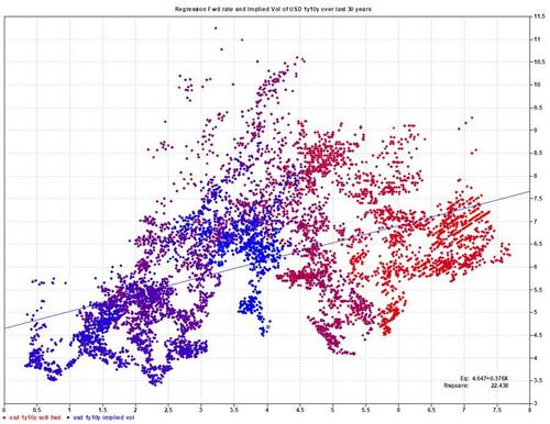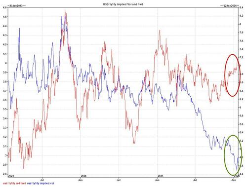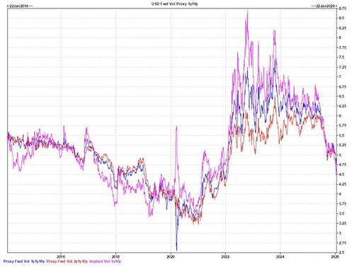4) Julien Thomas (Exotics Trading): Since liberation day last year, implied rate volatilities have decreased significantly, and since the beginning of this year, the street has seen a large supply of vol callable bonds. Given this dynamic, we think buying a Forward Volatility Agreement on 1y10y look attractive, given the low level of implied vols.