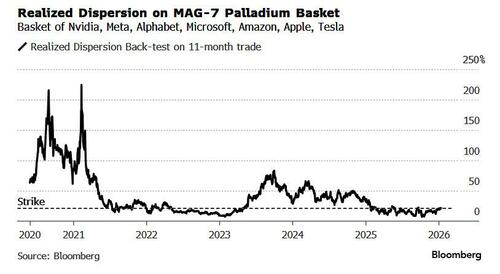 Big Tech is still likely to lead the market higher, and Magnificent Seven options are not particularly cheap. That’s why Barclays Plc strategists say buying outright calls isn’t cost-effective and a so-called Palladium structure — which bets on how scattered gains or losses will be across a basket of stocks instead of the performance of the basket itself — is better.