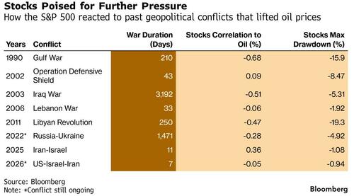 Finally, circling back to where we started, as oil prices keep pushing higher amid the Middle East disruptions, stocks have further reckoning to do if history is any guide.